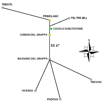Il Covolo di Butistone si trova lungo la strada statale 47 tra Cismon del Grappa e la frazione Primolano. Lo svincolo d'uscita per il covolo è accessibile solo per chi viaggia in direzione Trento (nord); chi viaggia in direzione Bassano del Grappa (sud) dovrà prendere la prima uscita per Cismon del Grappa quindi seguire le indicazioni per Trento-Covolo di Butistone.
